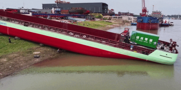 漢江流域首艘純電動集裝箱船下水
